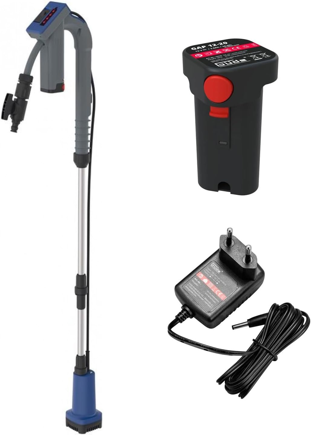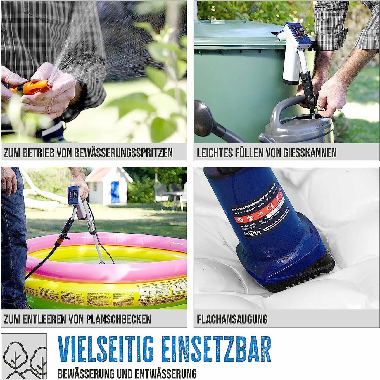 Акумулаторната помпа Gude е подходяща за изпомпване на чиста или дъждовна вода от големи съдове или резервоари, като варели, бидони, бурета и др, и може да я подава на височина до 11 метра.