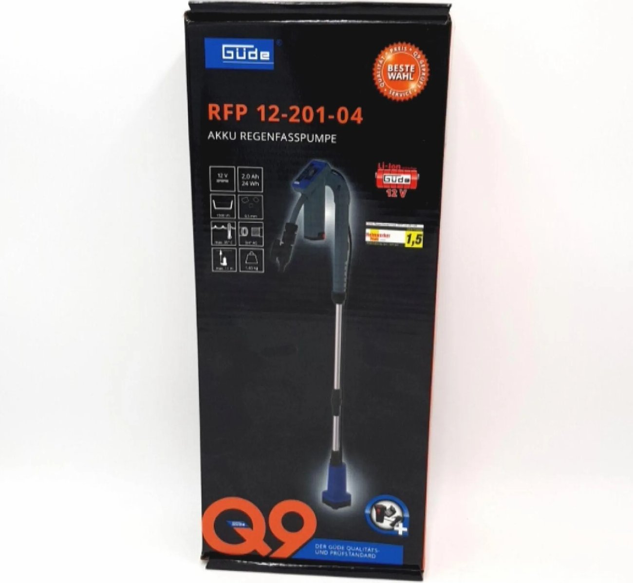 Gude RFP 12-201-04 е акумулаторна водна помпа с максимален дебит на изпомпване до 1500 литра в рамките на един час.