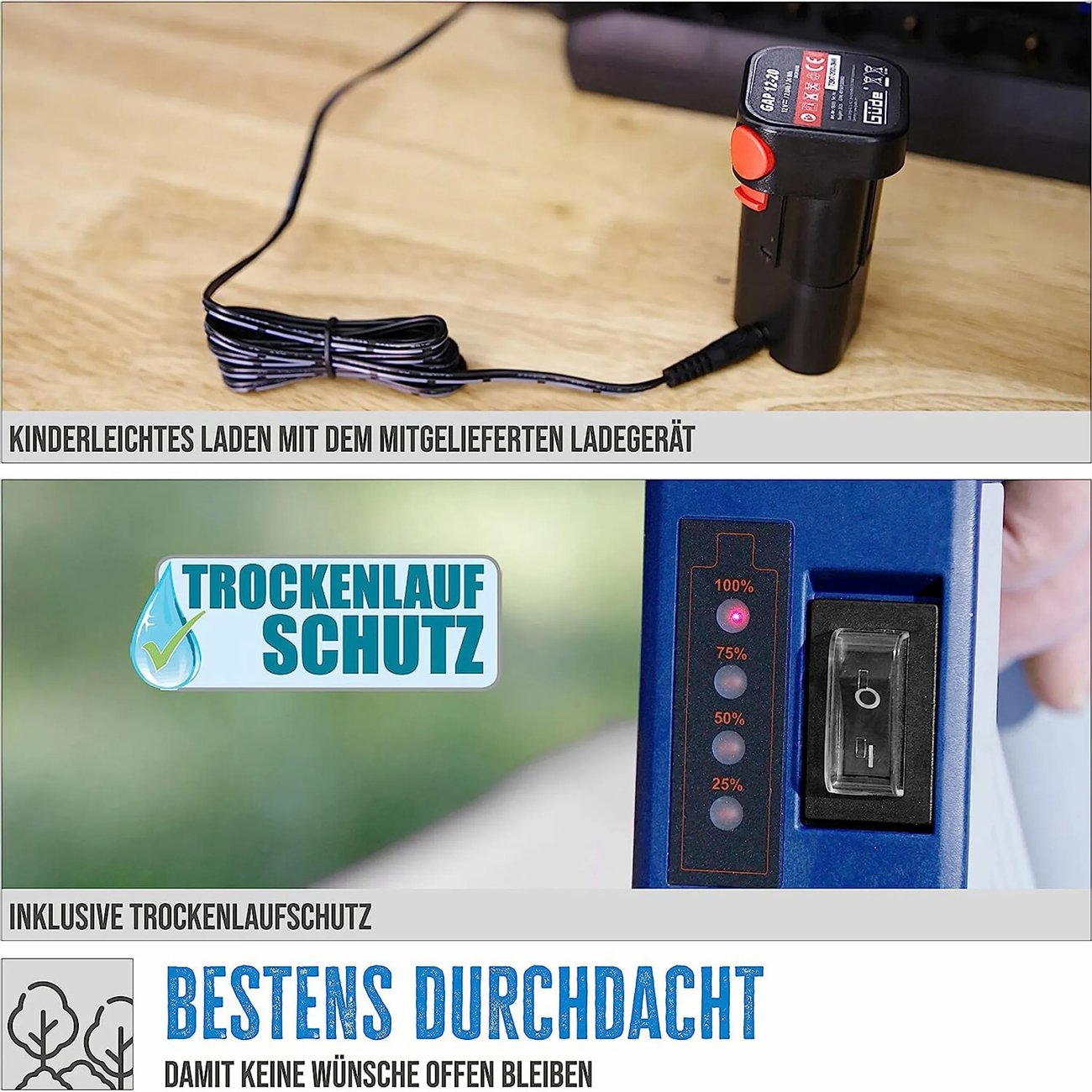 Помпата осигурява безжична и удобна работа на всякъде, като в комплекта са включени 12V Li-ion батерия с 2 Ah (ампер-часа) и зарядно устройство.