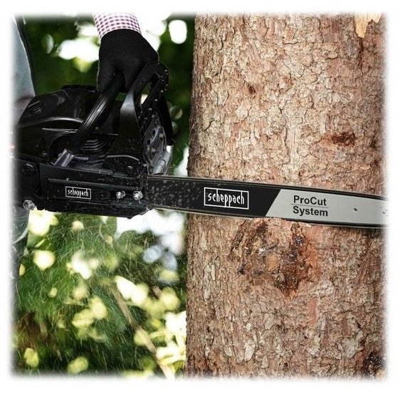 За прецизно рязане трионът разполага с 45-сантиметрова (18") шина, която осигурява максимална дължина на рязане до 40 см, като шината и веригата са Scheppach ProCut.