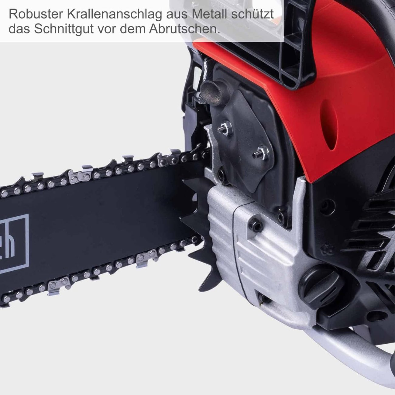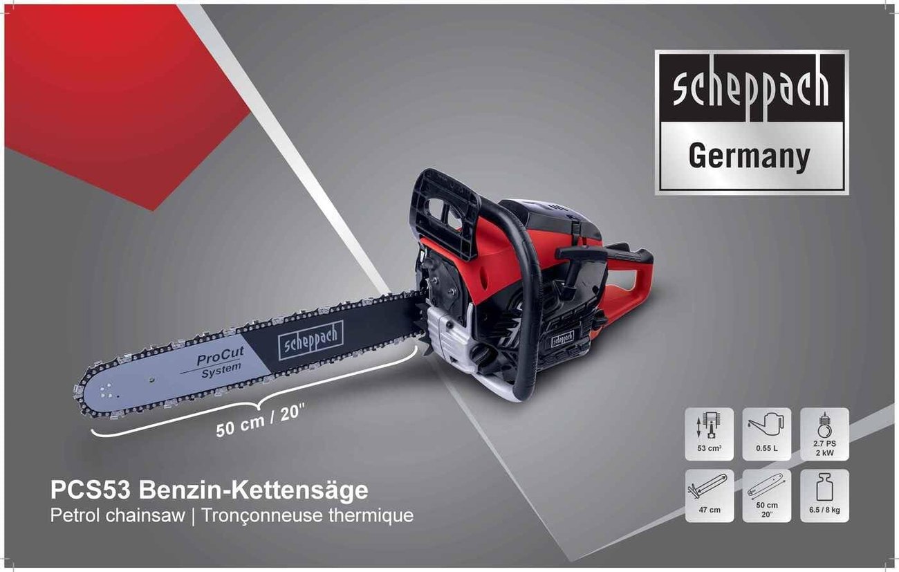 За прецизно рязане трионът разполага с 50-сантиметрово (20") режещо острие, както и висококачествени шина и верига Scheppach ProCut.