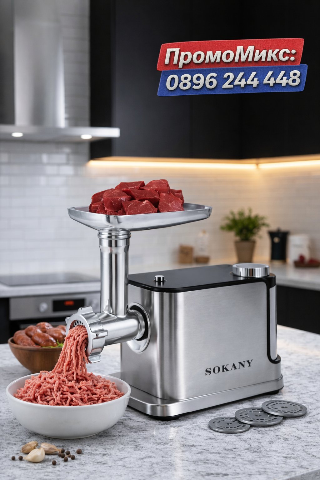 Месомелачката Sokany SK-06030 е подходяща за смилане на домати, кайма, наденици, суджук и др. домашни месни продукти.