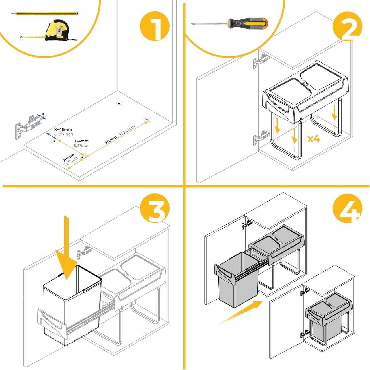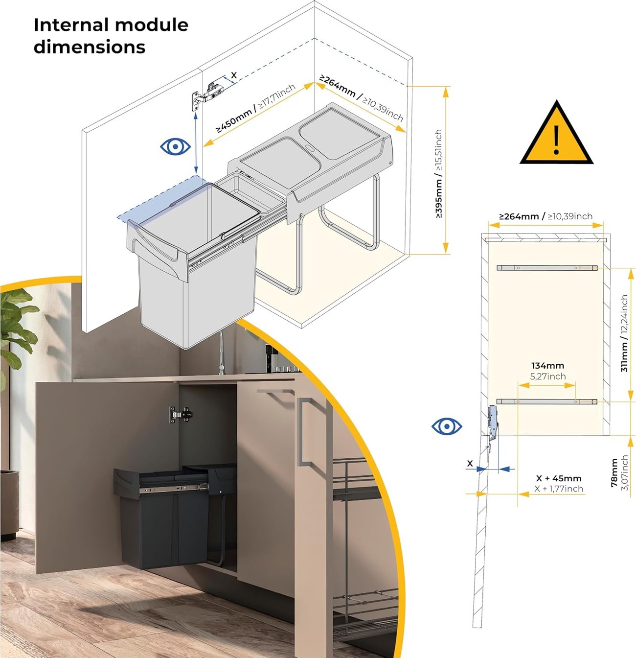 Коша за вграждане е подходящ за шкафове с минимална ширина 26.4 см, дълбочина 45 см и височина 39.5 см и над тези сантиметри.