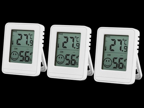 Падане - влошаване на времето Бързо падане - буря и ураган Покачване - подобряване на времето Бързо покачване - кратковременно добро време Термометърът и хигрометъра са настроени фабрично! Термометърът измерва температурата в градуси Целзий или Фаренхайт. Чрез контрол на стайната температура Вие се чувствате комфортно и спестявате разходи за отопление, до 6 % при един градус спадане на температурата. Хигрометърът измерва относителната влажност на въздуха. Твърде сухият въздух в помещението влошава здравето, като растенията, дървените подове и старите мебели също страдат. Правилната температура и влажност на въздуха се различават според начина на ползване на различните помещения: