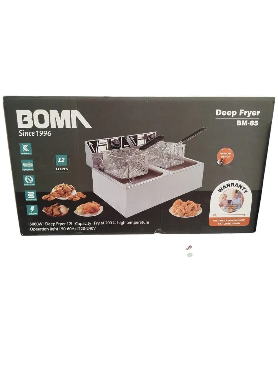 Boma BM85 е двоен фритюрник с мощност от 5000 W, изработен с 2 броя вани работещи поотделно или двете едновременно.