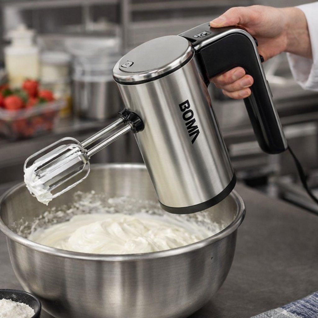 Boma BM1632 е професионален ръчен миксер с мощност 650 W и 5 степени за избиране на скорост за разбъркване и разбиване.