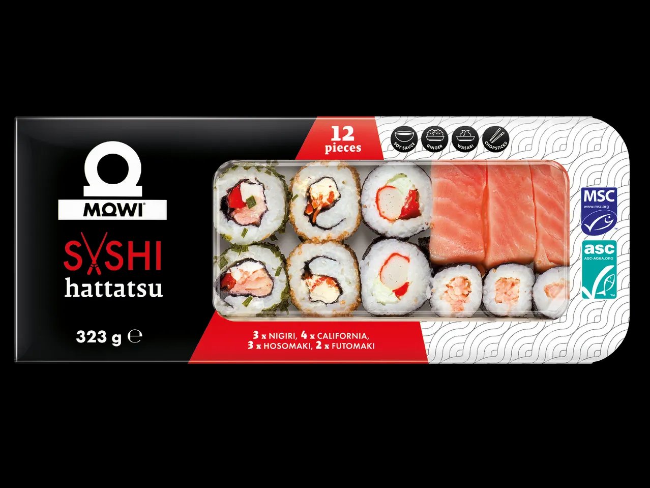 - С включени соев сос, джинджифил, уасаби и клечки за хранене