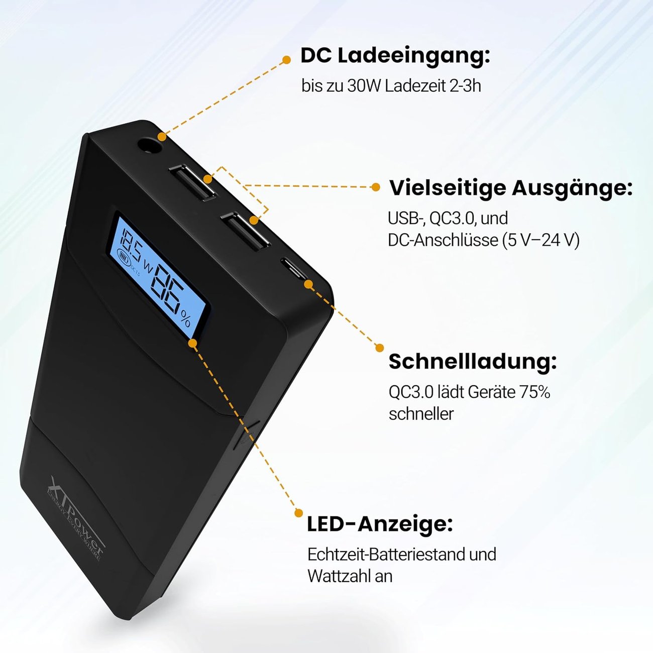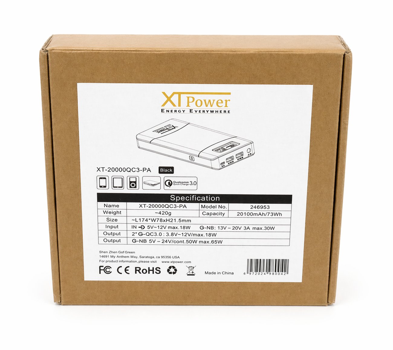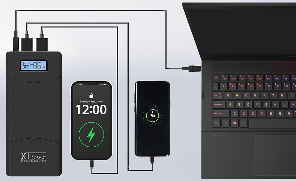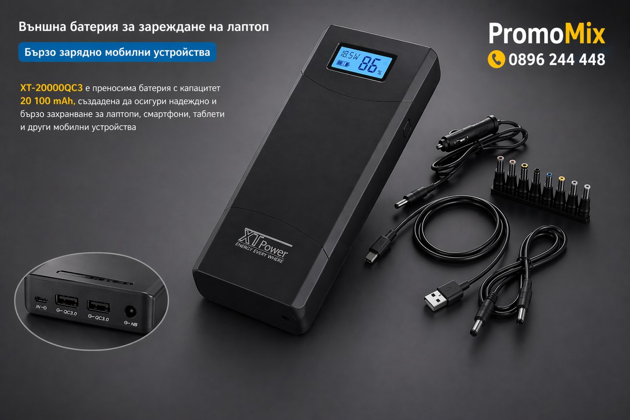 XT-20000QC3 е мощна преносима батерия с капацитет 20 100 mAh, подходяща за бързо зареждане на лаптопи, таблети, смартфони и др. мобилни устройства.