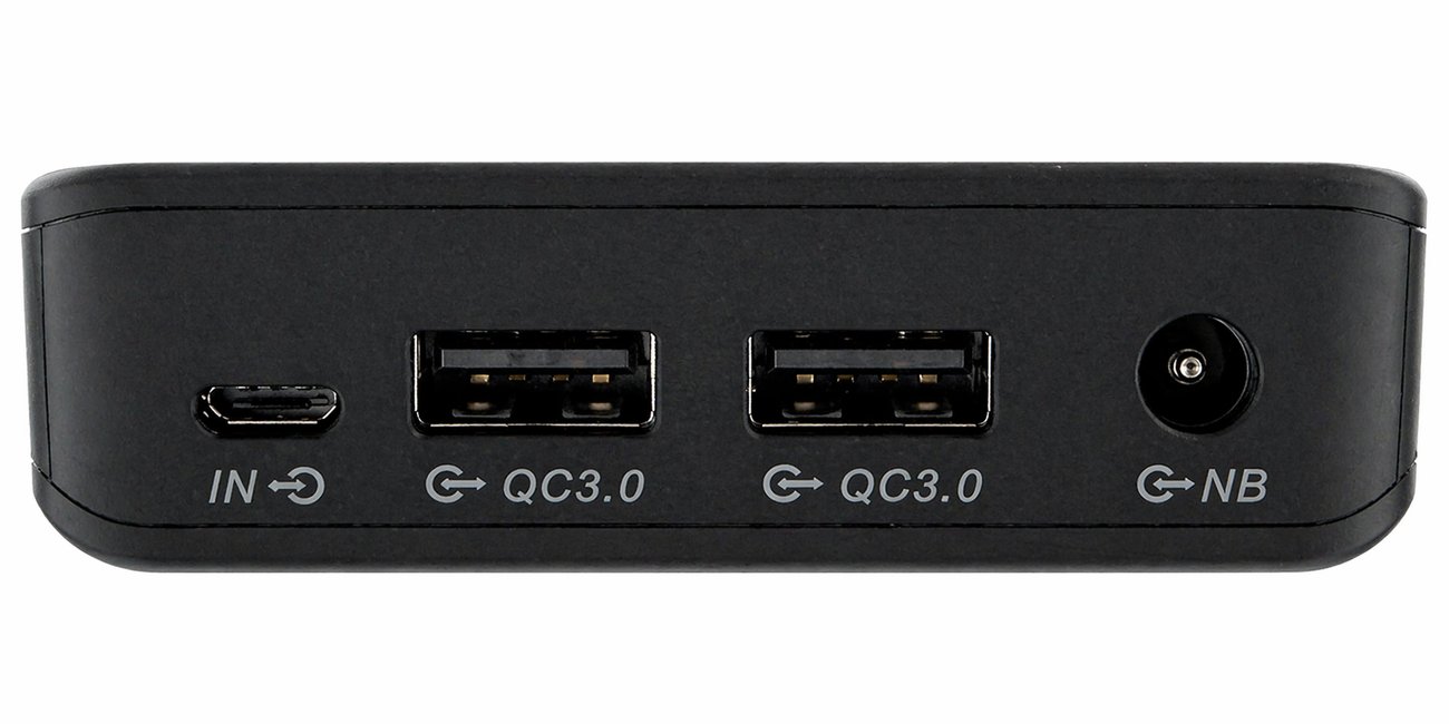 Модела разполага с общо 4 порта за зареждане – два за бързо зареждане USB QC 3.0 поддържащи 3.8V, 9V и 12V, един DC/NB порт поддържащ от 5V до 24V, подходящ за зареждане на лаптопи и др, и един универсален вход IN 5V, 9V и 12V предназначен за самото зареждане на батерията.